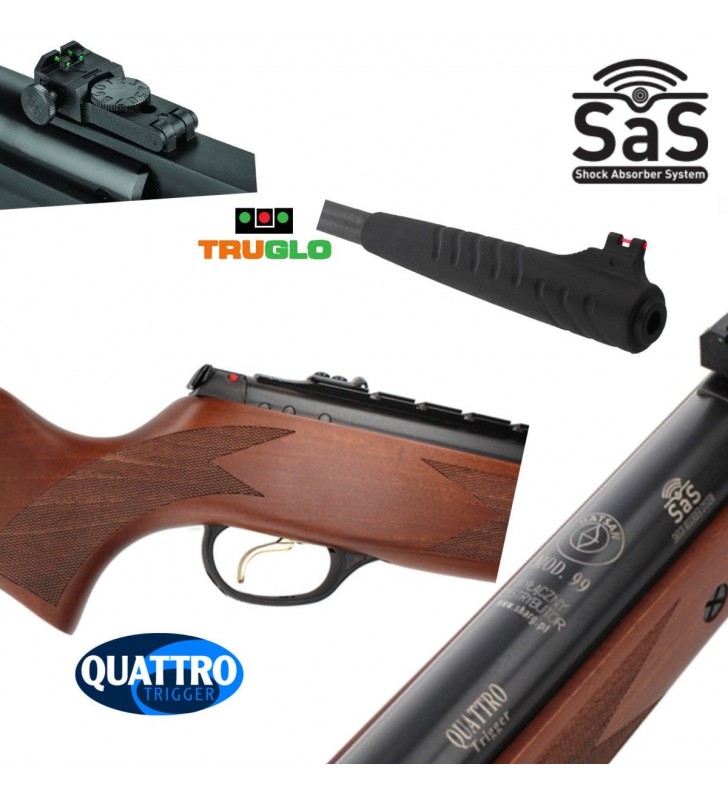 Hatsan MOD 99, klasyczna łamana wiatrówka z kolbą wykonaną z wyselekcjonowanego orzecha tureckiego. Zastosowano opatentowany system antywstrząsowy „SAS” co w połączeniu z absorbującą odrzut stopką kolby czyni karabinek przyjazny użytkownikowi. Przyczynia się to dodatkowo do minimalizowania zużycia podzespołów karabinka i wrażliwej optyki jeśli jest zamontowana.