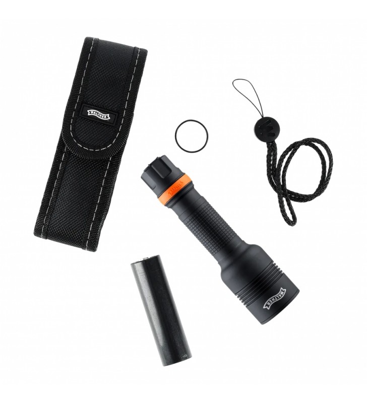 W zestawie: latarka Walther HFC1, 2 baterie CR123, plastikowy adapter do baterii, smycz, metalowy klips, zapasowa uszczelka oraz nylonowe etui.