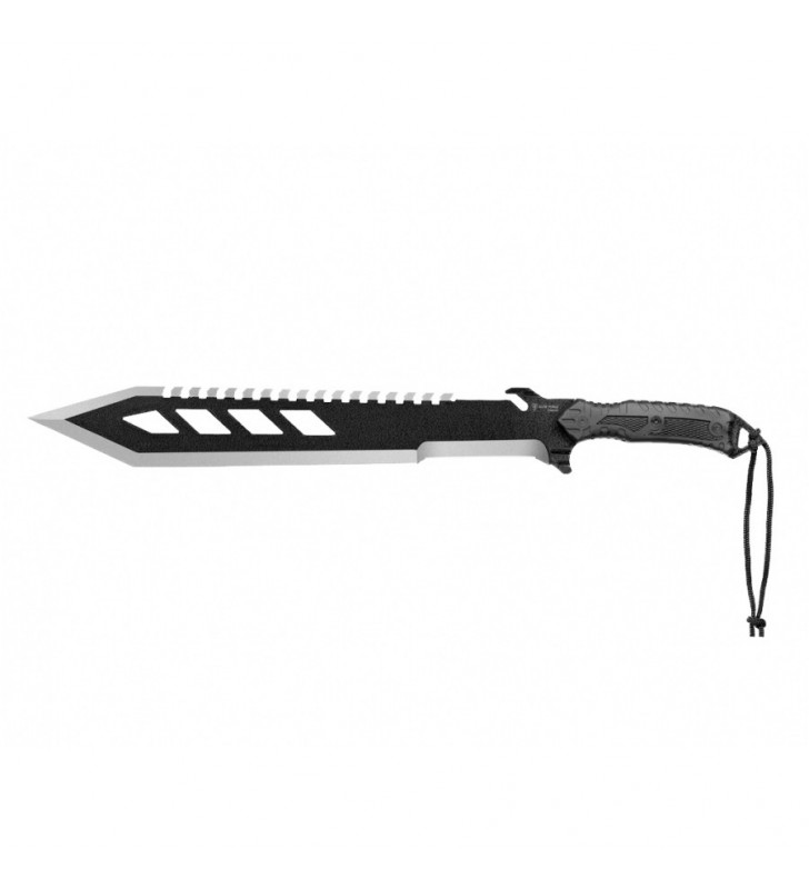 Wycięcia w klindze (zmniejszające ciężar) oraz czarne pokrycie antykorozyjne nadaje maczecie lekko futurystycznego wyglądu.