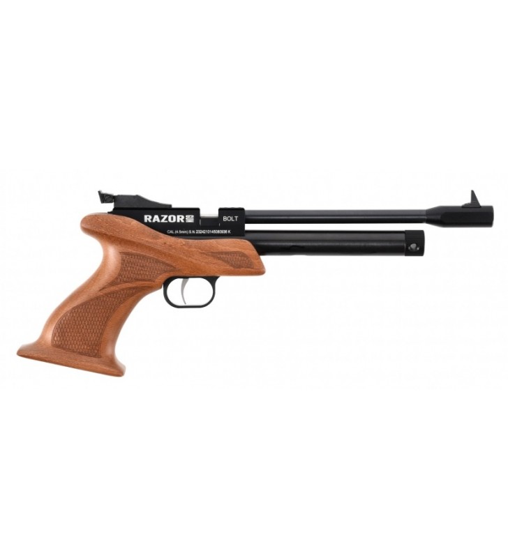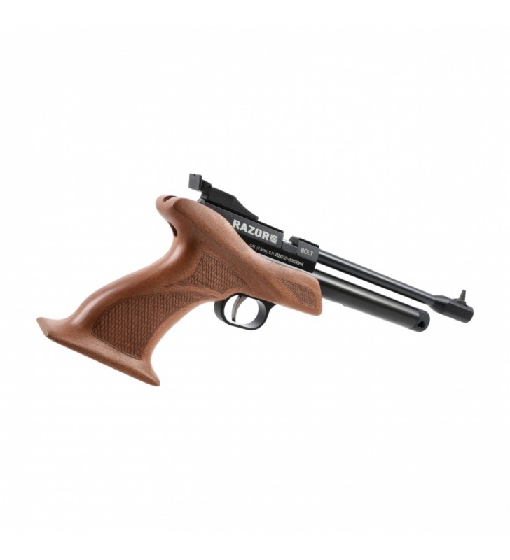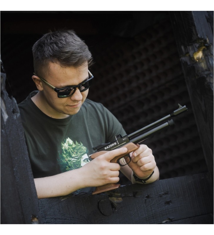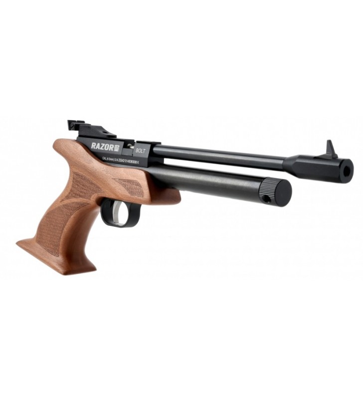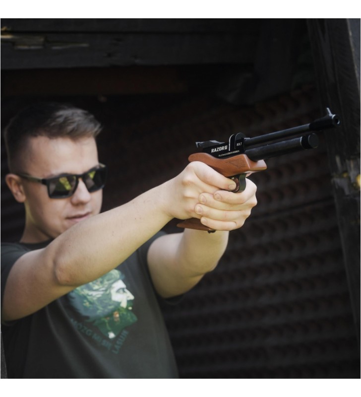 RazorGun BOLT ma nowoczesną osadę z wytrzymałego tworzywa, bruzdowaną stalową lufę, mechaniczne przyrządy celownicze oraz szyną 11 mm do montażu celownika optoelektronicznego. Sportowy charakter wiatrówki podkreśla jej ergonomiczny chwyt przystosowany do montażu kolby. Dzięki takiej funkcjonalności wiatrówka zapewnia stabilny chwyt podczas strzelania z jednej ręki. Pistolet zasilany jest 12 g kapsułą CO2 montowaną w metalowej tubie pod lufą.