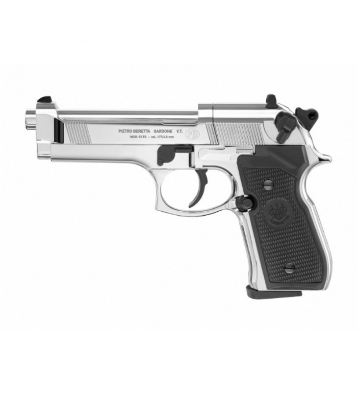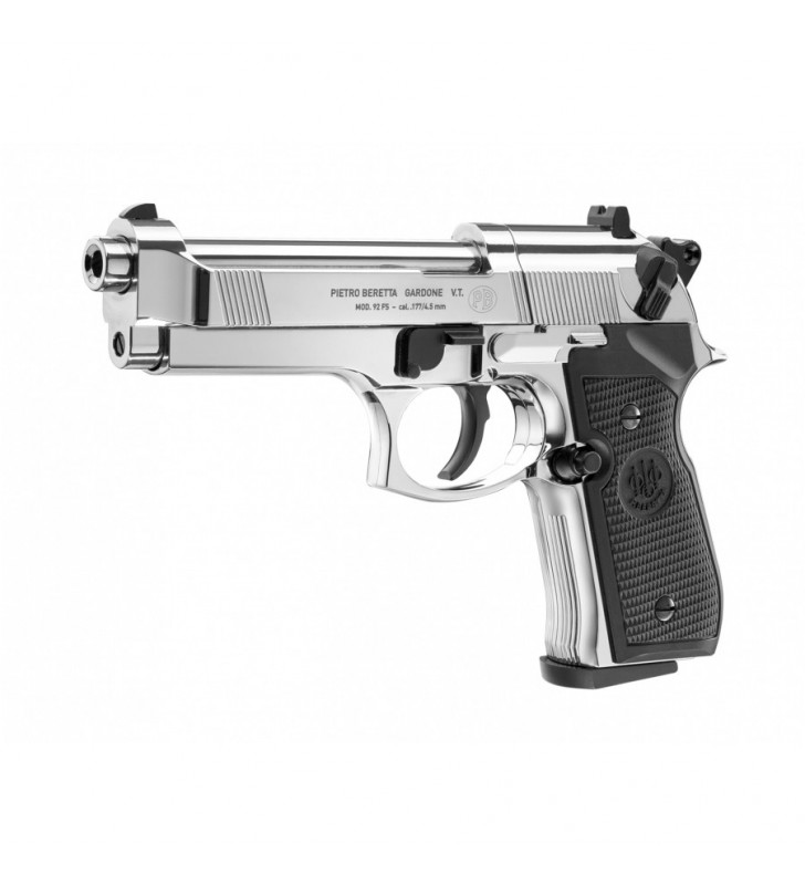 Beretta M92 FS 4,5 mm to efektowna wiatrówka o metalowej konstrukcji, wyposażona w gwintowaną lufę, mechanizm spustowy SA/DA, obustronny bezpiecznik oraz teksturowane okładziny.