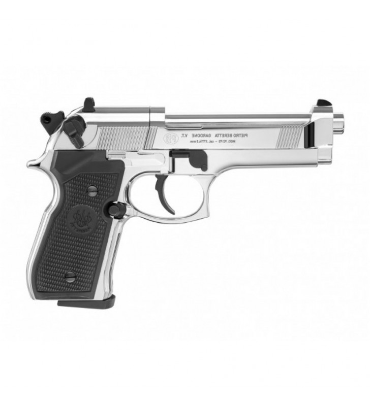 Wiatrówka poza polimerowymi okładzinami rękojeści została wykonana w całości z metalu, dzięki czemu otrzymujemy solidny, dobrze leżący w dłoni pistolet pneumatyczny. Wysoką jakość podkreśla frezowany zamek oraz doskonałe spasowanie i odwzorowanie wszystkich detali, wiernie przeniesionych z kultowej Beretty M92. Obustronny bezpiecznik skrzydełkowy umożliwia wygodną obsługę strzelcom prawo i leworęcznym.