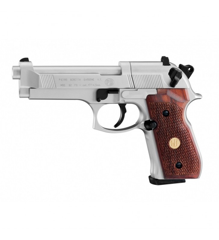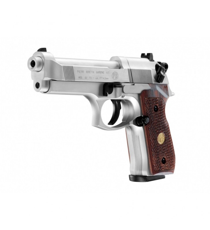Beretta M92 FS nickel/wood 4,5 mm Diabolo CO2 to efektowna wiatrówka o metalowej konstrukcji, wyposażona w gwintowaną lufę, mechanizm spustowy SA/DA, obustronny bezpiecznik oraz eleganckie drewniana okładziny.
