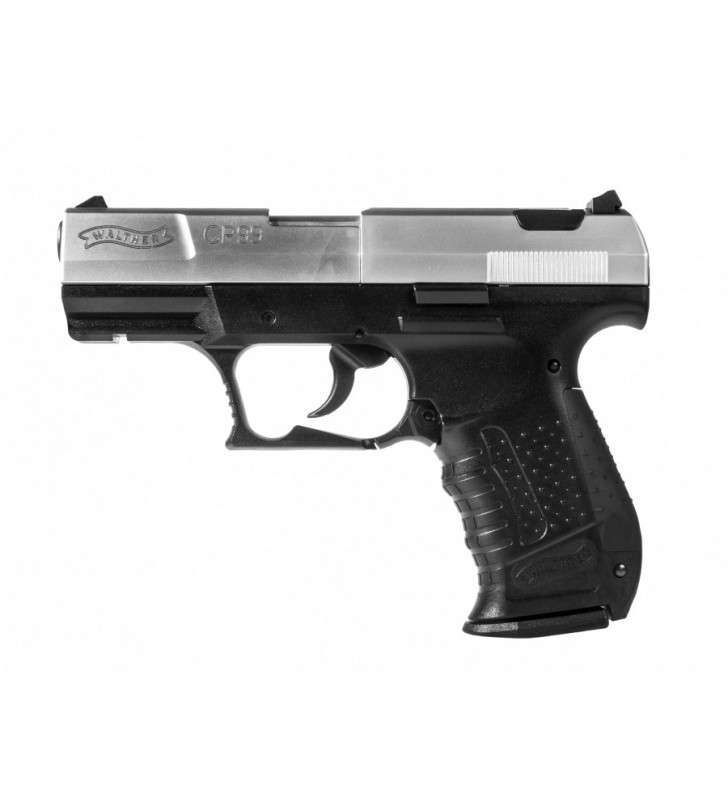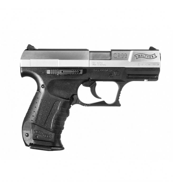 Walther CP99 Bicolor to popularny pistolet wiatrówkowy strzelający standardowym śrutem diabolo 4,5 mm, wyposażony w decocker, system szybkiej wymiany magazynka oraz wymienne nakładki rękojeści.