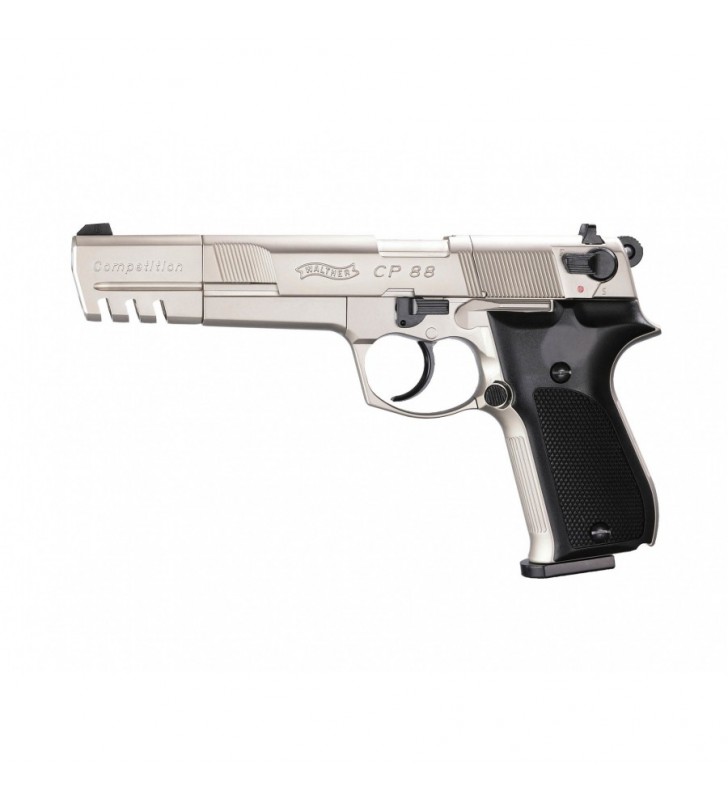 Walther CP88 w wersji Competition został wyposażony w dłużsżą 5,5" lufę oraz kompensator, które zapewniają lepsza celność oraz nadają wiatrówce sportowego charakteru. Pistolet ma efektowne wykończenie techniką niklowania.