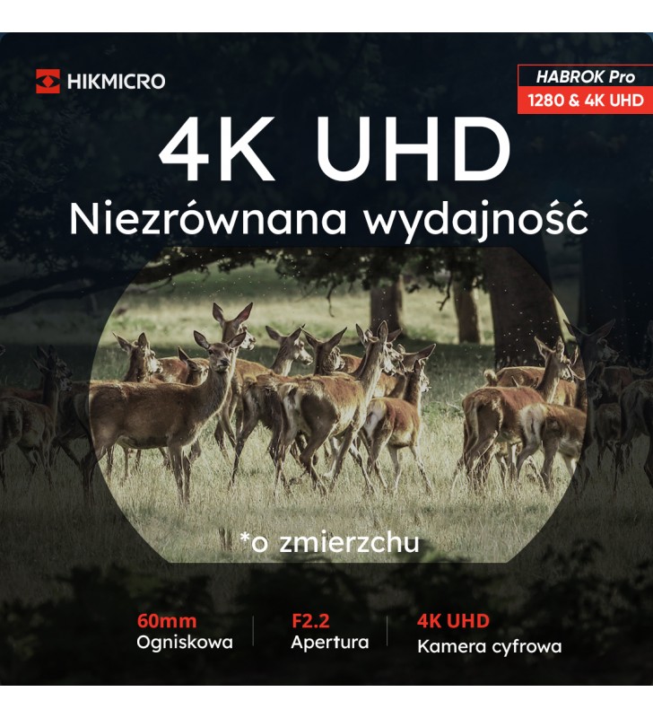 Kolorowy detektor 4K UHD z obiektywem 60mm w HIKMICRO Habrok Pro HQ50LN zapewnia krystaliczną przejrzystość w ciągu dnia, nawet o zmierzchu. Ta lornetka termowizyjna i cyfrowa dostarcza najwyższego poziomu szczegółowości i odtwarza kolory z naturalną wiernością.