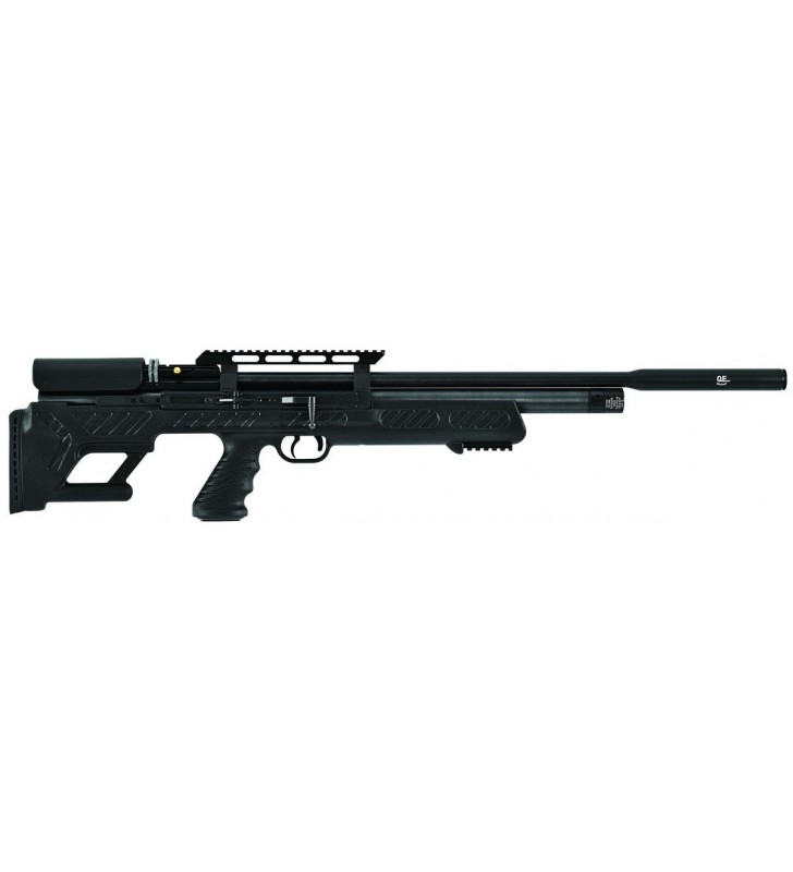 Bullboss mocna wiatrówka Hatsan. Dzięki zastosowaniu układu bezkolbowego uzyskano kompaktowe wymiary karabinu przy zachowaniu normalnej długości lufy gwarantującej doskonałą celność i zmniejszony podrzut. Dokładna lufa Hatsan QE ze zintegrowanym tłumikiem