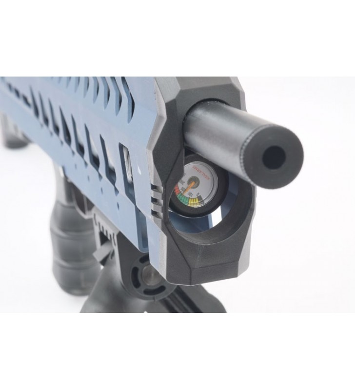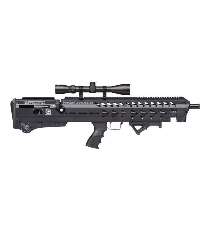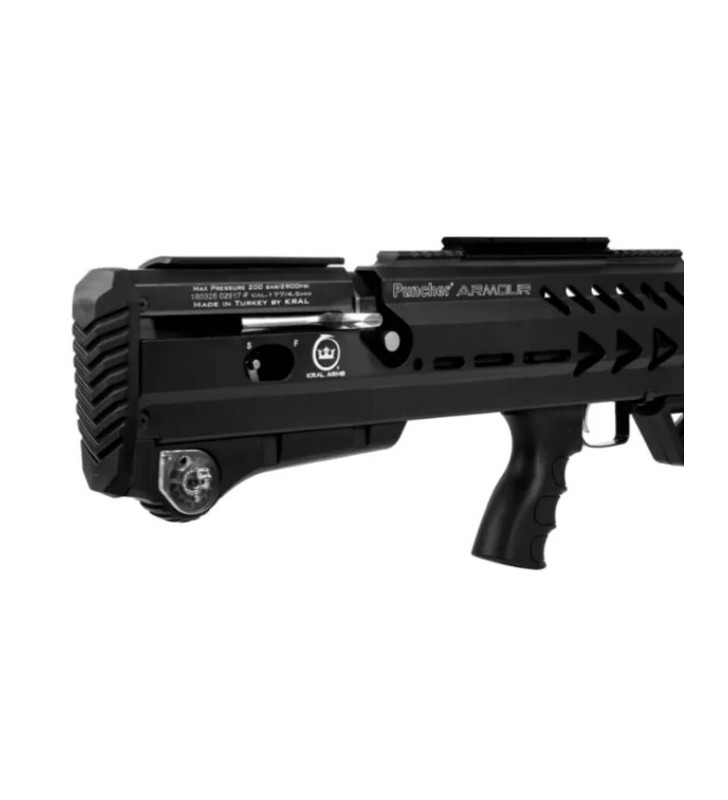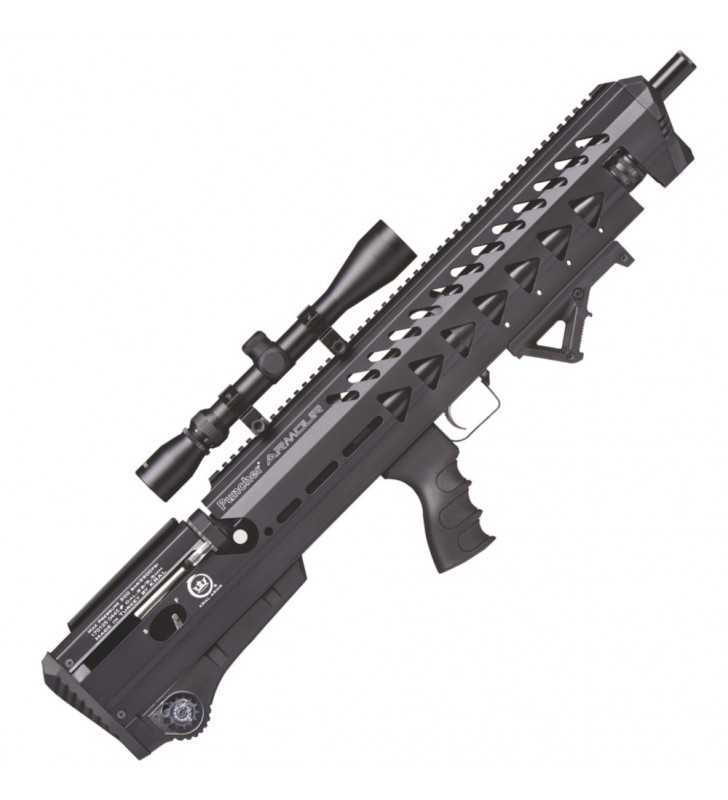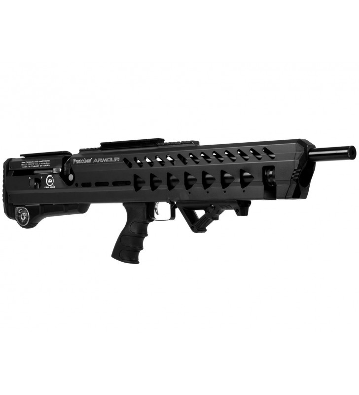 Układ bezkolbowy oraz czarny kolor podkreślają taktyczny charakter tej wiatrówki. Puncher ARMOUR - BLACK zasilany jest z metalowego kartusza o pojemności 280 cc o maksymalnym ciśnieniu 200 bar. Ciekawym rozwiązaniem jest ukrycie kartusza w efektownej aluminiowej osłonie. Zintegrowany manometr pozwala kontrolować ciśnienie w cylindrze, a tym samym poziom jego naładowania. Napełnianie kartusza może odbywać się przy pomocy standardowej butli HP (z użyciem odpowiedniej przejściówki) lub przy użyciu specjalnej ręcznej pompki do karabinków PCP. Karabinek charakteryzuje się znakomitą celnością i dużym zasięgiem. Dzięki zastosowaniu aluminium karabinek jest wyjątkowo lekki.