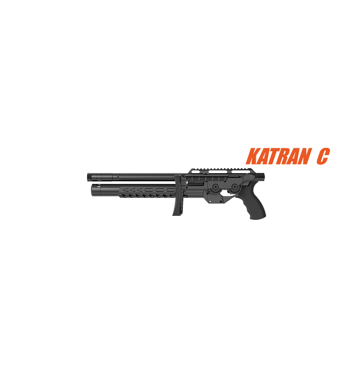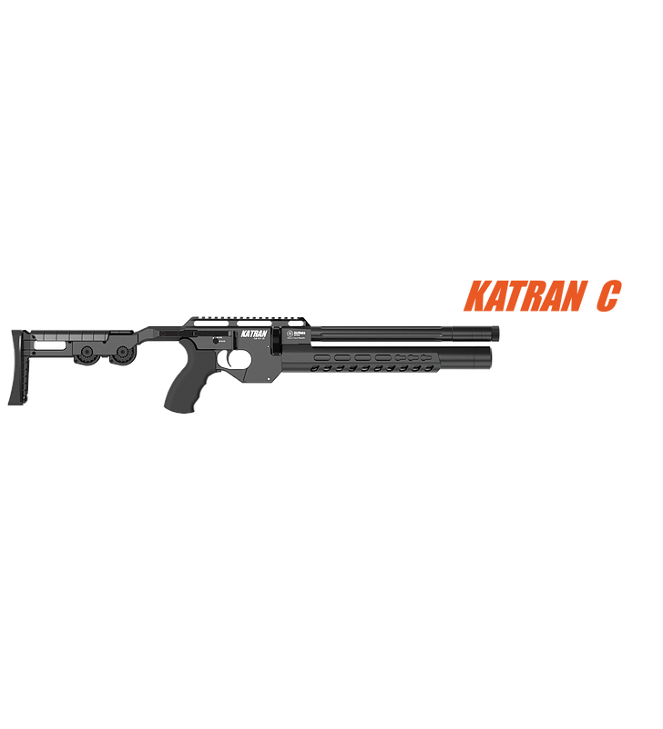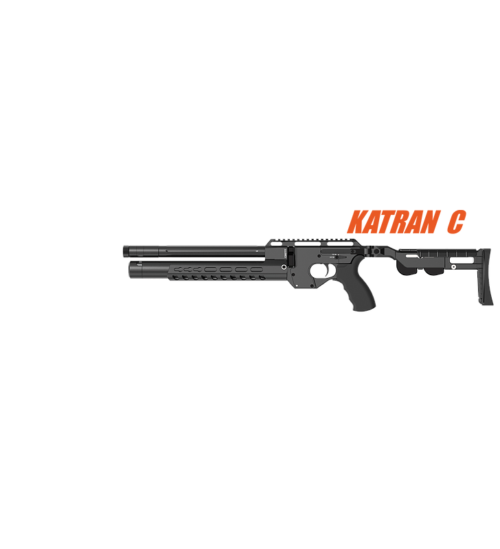 Najbardziej kompaktowa wersja serii KATRAN. Lekka i wygodna wiatrówka KATRAN posiada ergonomiczny prawy chwyt AR15, składaną kolbę z regulowaną stopką i policzkiem. Aluminiowy chwyt przedni ma 9 slotów KeyMod do montażu akcesoriów. Łatwo napinana dźwignia boczna wygodnie usytuowana w pobliżu spustu z możliwością zmiany strony prawej na lewą. Spust posiada 2-stopniową regulację. KATRAN jest również wyposażony w system zapobiegający podwójnemu naładowaniu. Posiada regulator cisnienia. Szyna montażowa 20MOA Picatinny 1/2" UNF