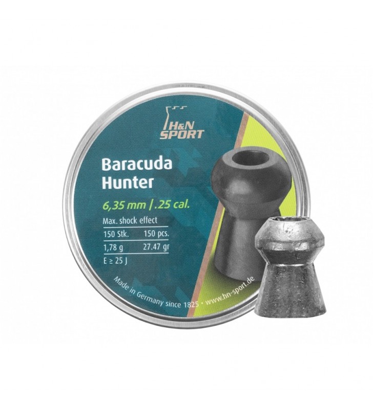 Diabolo H&N Baracuda Hunter 6,35/150 to ciężki, bardzo precyzyjny śrut do strzelań Field Target oraz długodystansowych. Otwór na czubku śrutu, zapewnia dużą energię obalającą, kontrolowaną deformację oraz doskonałą aerodynamikę. Śrut cechuje się doskonałą powtarzalnością oraz precyzją, dlatego oprócz strzelania sportowego na zachodzie Europy jest również wykorzystywany do polowań na drobną zwierzynę.