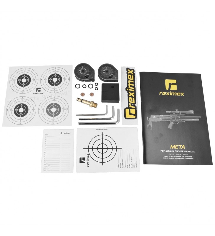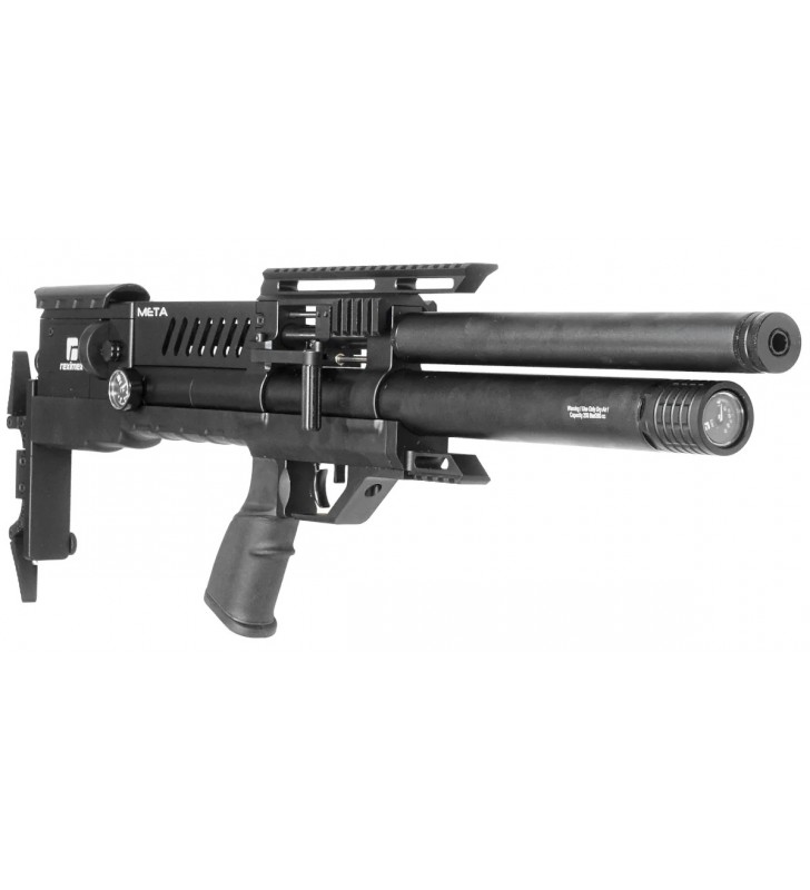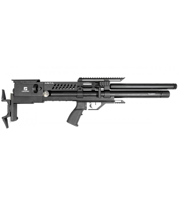 Reximex Meta, nowoczesna wiatrówka PCP w znanej z przesunięcia komory i magazynika za spust wersji bullpup. Poprzez zastosowanie układu bezkolbowego, uzyskano kompaktowe wymiary karabinu, przy zachowaniu normalnej długości lufy gwarantującej celność i zasięg oraz typową dla tej konstrukcji redukcję wagi dla lepszej kontroli. Wiatrówkę wyposażono w dźwignię napinania Side Lever, regulator mocy strzału, regulowaną w 3 płaszczyznach stopkę, monopod oraz lufę ze zintegrowanym tłumikiem dźwięku.