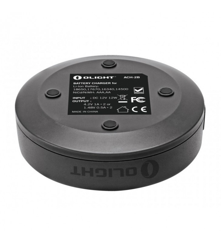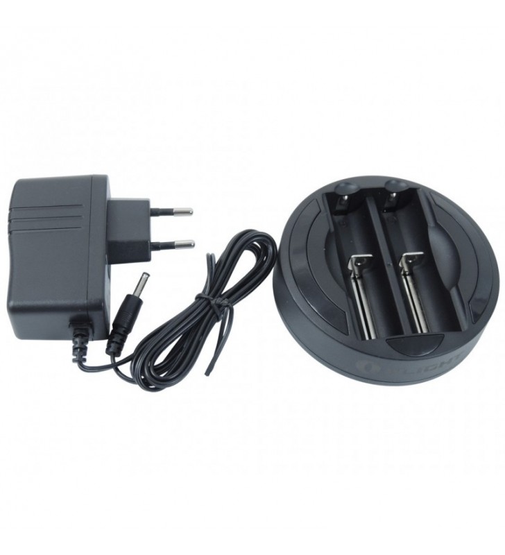 Uniwersalna ładowarka OMNI-DOK II firmy Olight. Za jej pomocą można ładować akumulatory litowo-jonowe i litowe typu RCR 123A, 18650, 17670, 14500 oraz niklowe typu AA i AAA.