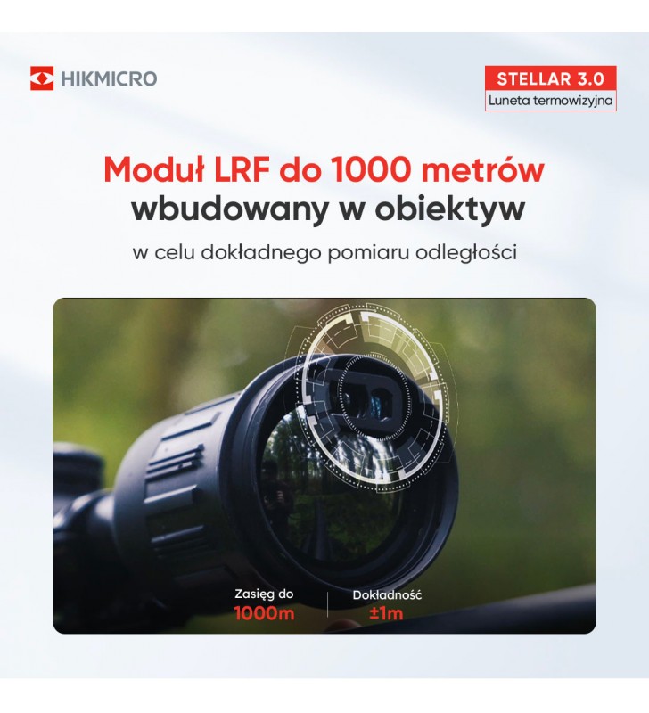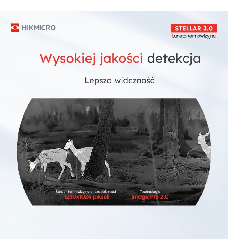 Luneta Termowizyjna HIKMICRO STELLAR SH50L 3.0 jest wyposażona w sensor termowizyjny 384×288 @12μm o znacznie wyższej czułości (NETD<15mK) oraz najnowszy algorytm przetwarzania obrazu (Image Pro 2.0) i system bezprzetwornikowy (HSIS), co zapewnia uchwycenie najdrobniejszych szczegółów niezależnie od warunków pogodowych czy oświetleniowych, bez przerw. Dzięki większemu wyświetlaczowi AMOLED 1,03 cala o rozdzielczości 2560×2560, SH50L 3.0 ułatwia szybkie i precyzyjne namierzanie celów. Luneta jest głównie stosowana do polowań w terenie i lesie.