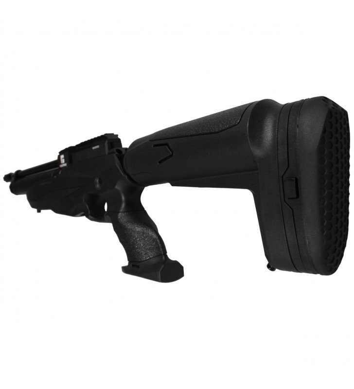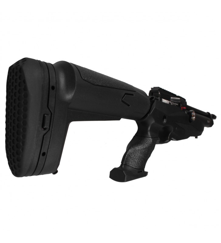 Reximex Tormenta to nowoczesny, wielostrzałowy karabin PCP o regulowanej mocy strzału. Wyposażony w regulowaną stopkę, regulowany język spustowy oraz podwójny kartusz o łącznej pojemności 380 ml. Osada z chwytem pistoletowym wykonana jest z wytrzymałego polimeru.