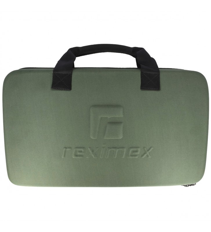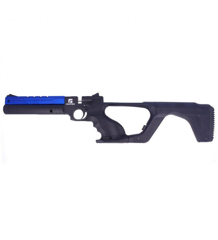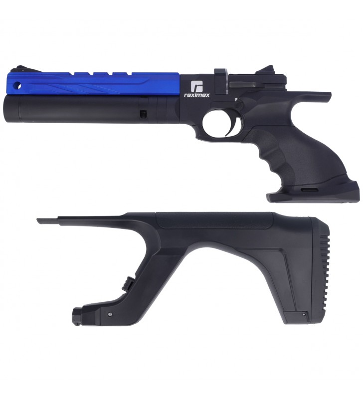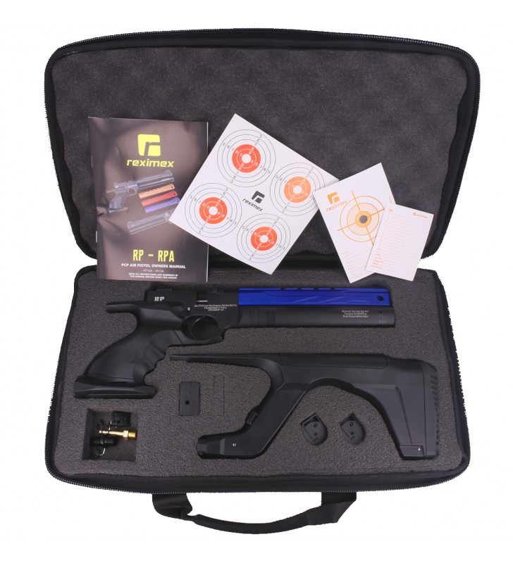 Reximex RP Blue precyzyjny, wielostrzałowy pistolet sportowy PCP z zamkiem w kolorze czerwonym oraz regulatorem umożliwiającym oddawanie powtarzalnych strzałów. Wyposażony w regulowaną szczerbinę i regulowany język spustowy oraz zbiornik ciśnieniowy o pojemności 50 cc. Anatomiczna rękojeść z półką z możliwością mocowania kolby.
