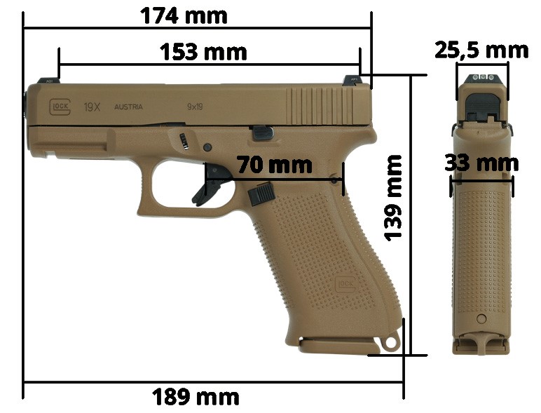 Model 19X to pistolet typu crossover, łączący elementy konstrukcji dwóch najbardziej popularnych modeli pistoletów Glock tj. pełnowymiarowego szkieletu G17 oraz kompaktowego zamka pistoletu G19.